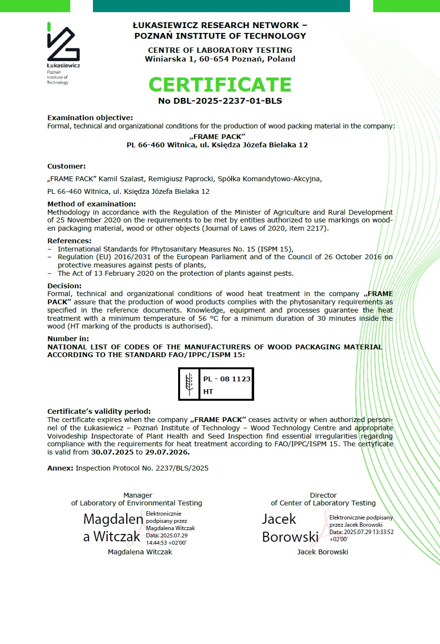 OWS stanowi integralną część wszelkich umów sprzedaży zawieranych przez firmę FRAME PACK, w tym również umów zawieranych w formie pisemnego zamówienia, oferowanych na rzecz podmiotu, który dokonuje zakupu.